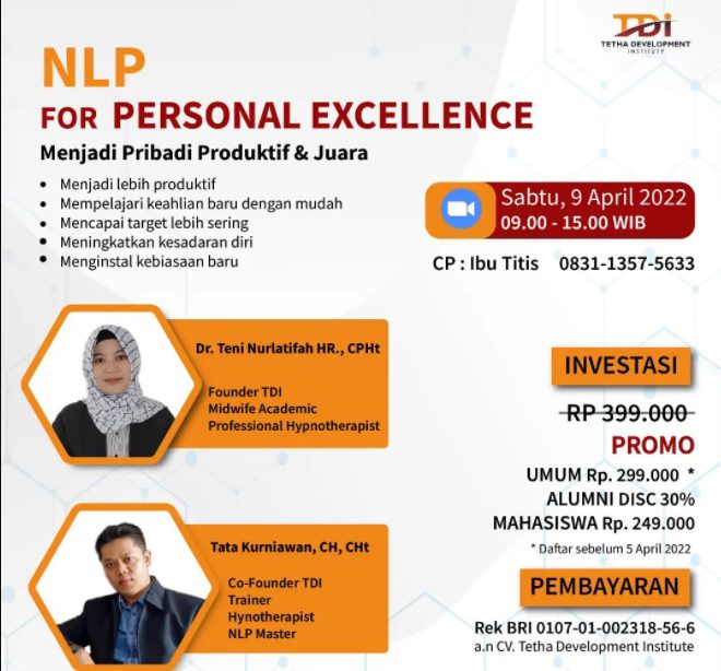 Anda akan belajar NLP bersama Pakarnya yang sudah menginspirasi ribuan orang untuk berkembang lebih maju menjadi pribadi yang berkualitas.